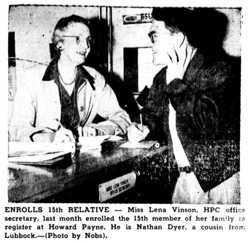 Signing up new students at Howard Payne College is getting to be a family affair for Miss Lena Vinson, HPC office secretary. Last month she registered Nathan Dyer, a cousin from Lubbock, her 15th relative to enroll for classes at Howard Payne since the school opened in 1889.