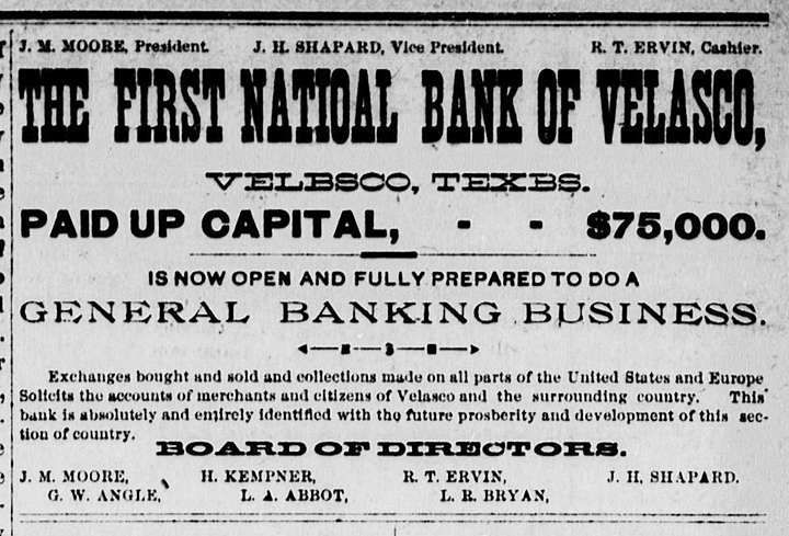The organization of the First National Bank of Velasco with a capital of $75,000 was completed on the 12th and the bank will open as such, December 1st, prox.