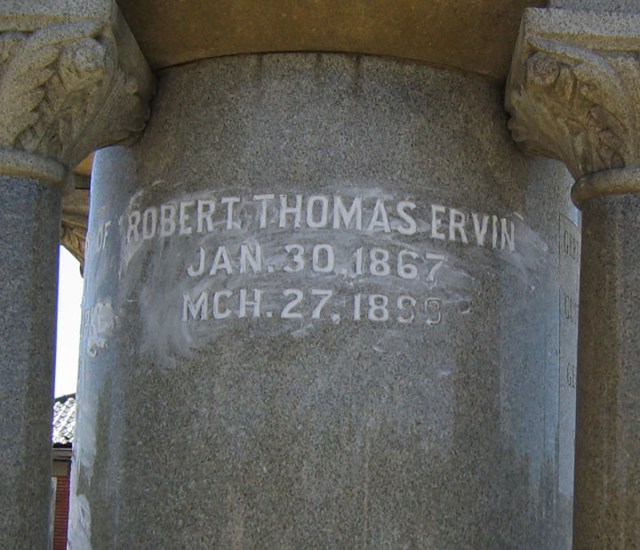 At this late date, it is impossible to know what effect this scandal had on Ervin’s life, both public and private, though we can certainly hazard a guess. In 1899, was this sort of affair enough to ruin a man of Robert Ervin’s standing? What were the social consequences, not only for Robert, but also for his wife and children? Would there be damage to Charles Clarke’s reputation? After what must have been a terrible month of gossip and sideways glances, arguments and tears, Robert Thomas Ervin succumbed to the pressure and died. He was 32.
